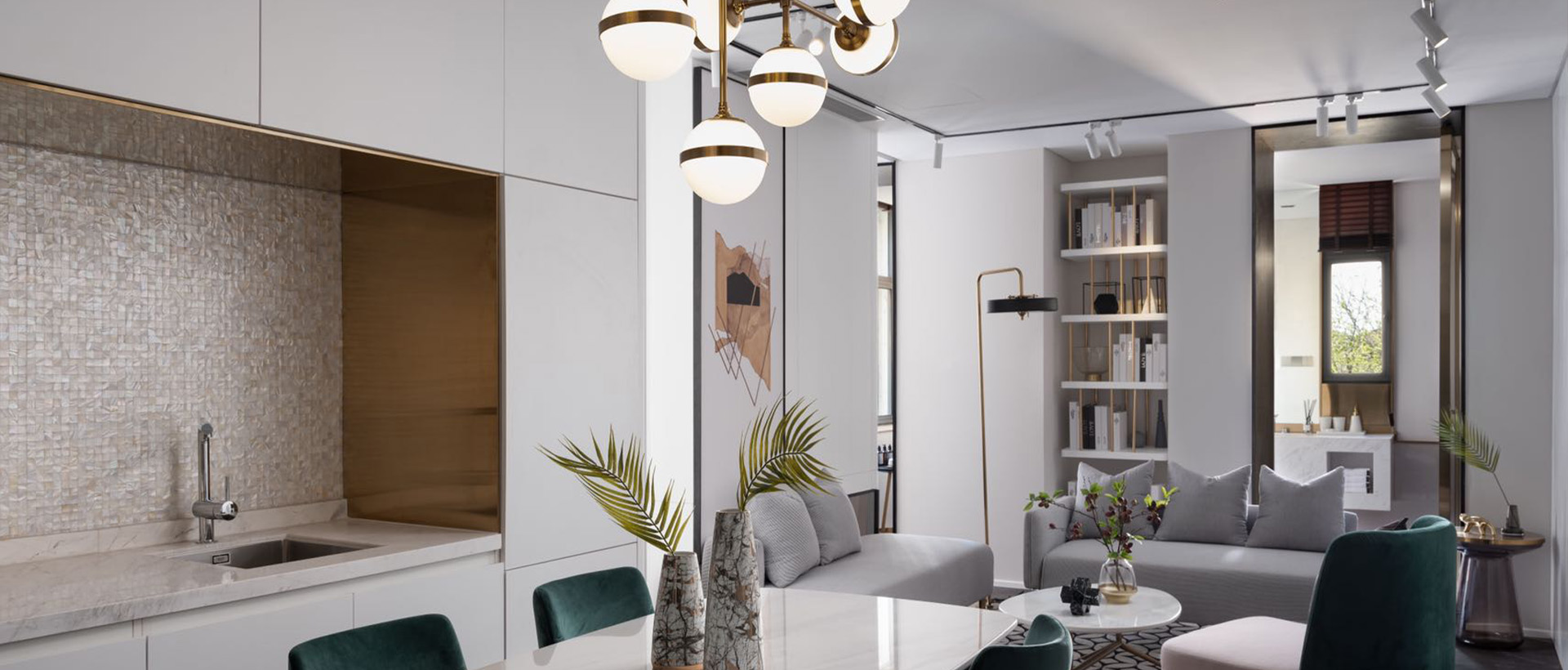 凯文公寓紧邻徐家汇公园以及衡山公园,是一座总高9层的优秀历史建筑,浪漫梧桐树街道,毗邻徐家汇商圈,马路对面就是国际网球中心,周边交通便利,设施齐全。总计有42套精致装修和布置的服务式公寓单元,整体融合了经典怀旧与现代时尚风格,部分房间带有独用的露台,闹中取静,具有独特的居住体验。